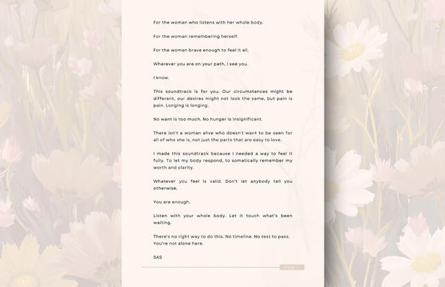 Play it while you work, drive, or cook. Or sit with it and let it touch what you've been holding.Return to tracks that mirror where you are. Skip ahead to where you're going. Some songs will wreck you today and feel neutral next month.That's the body speaking. Listen.Let your body move if it wants to. Dance, sway, cry, rage. There's no wrong way to receive this.