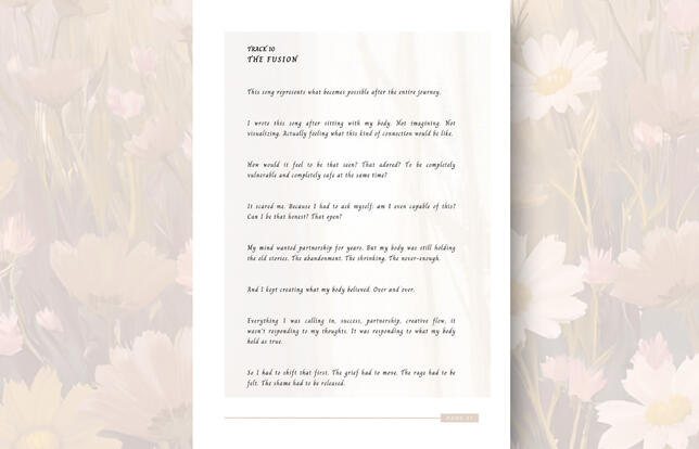 The Companion Booklet:• 43-page PDF with the personal story behind each track, full lyrics, and emotional context for each stage of the journey. The booklet is your companion guide through the landscape the music creates.